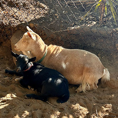 Juniper is one of the sweetest goats we’ve ever met. She is super affectionate and loves being pet and scratched. She’ll sit next to you as long as you’re willing to stay.